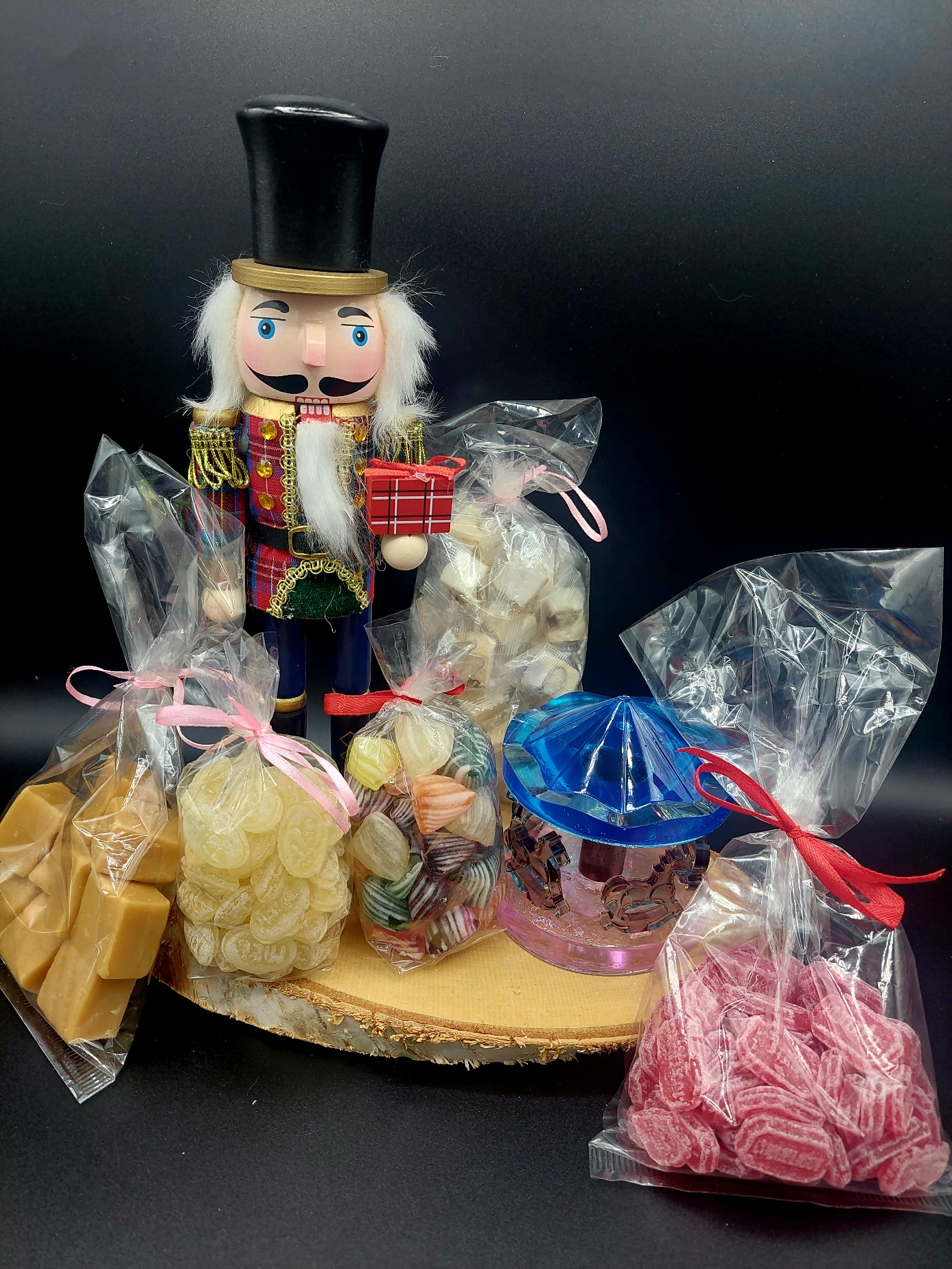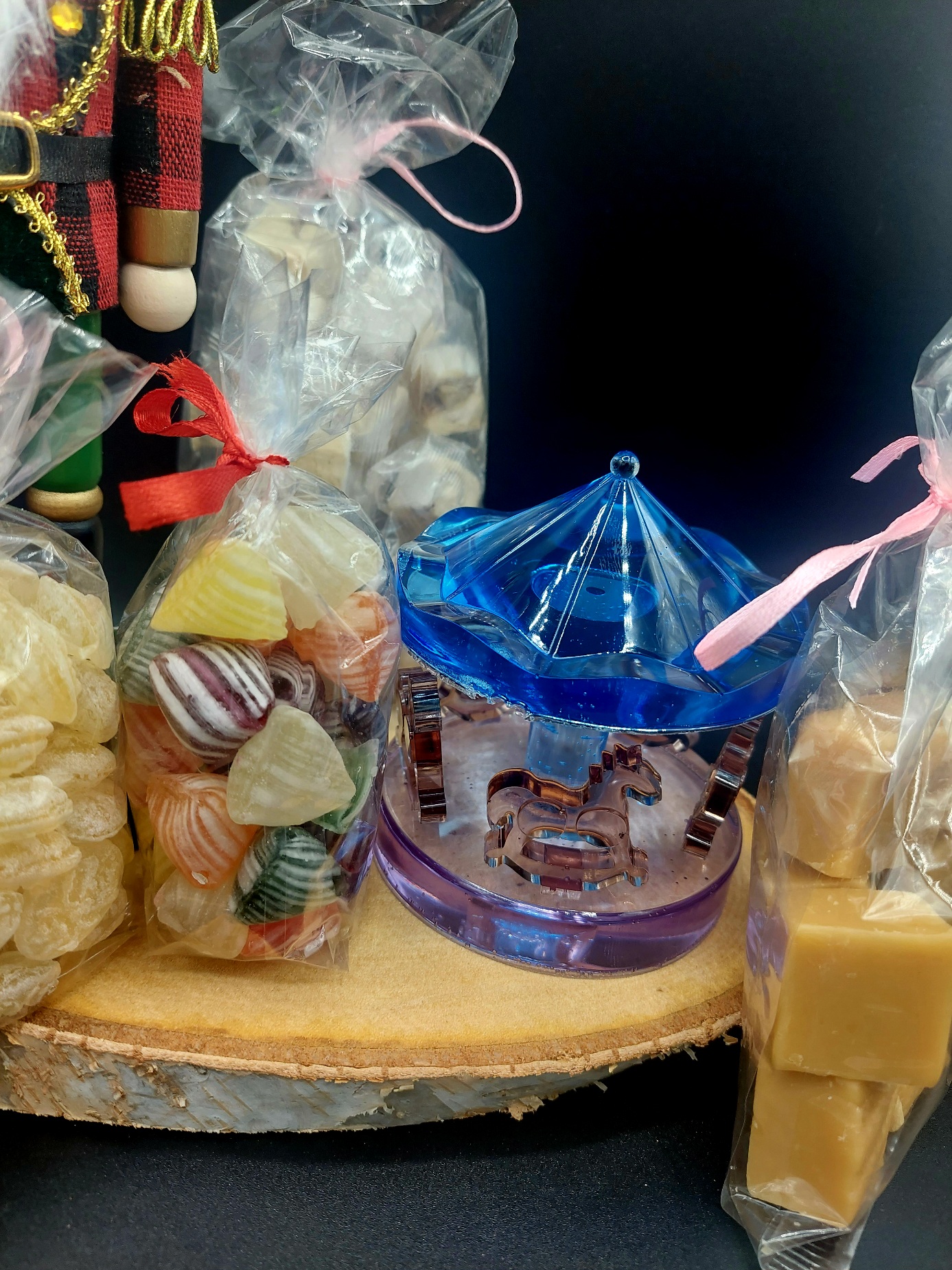 Un casse-noisette en bois de 25 cm de haut et un petit carrousel en résine, le tout sur une tranche de bouleau.